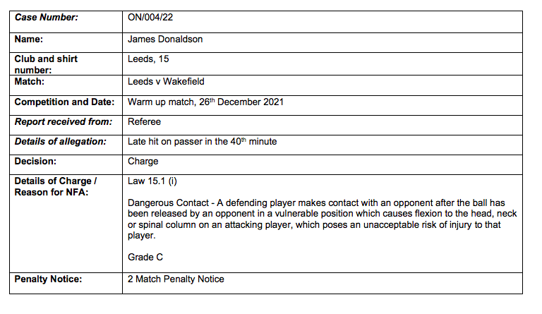 Yesterday, the news that Leeds Rhinos forward James Donaldson had been handed a two-match ban by the RFL disciplinary committee was announced.